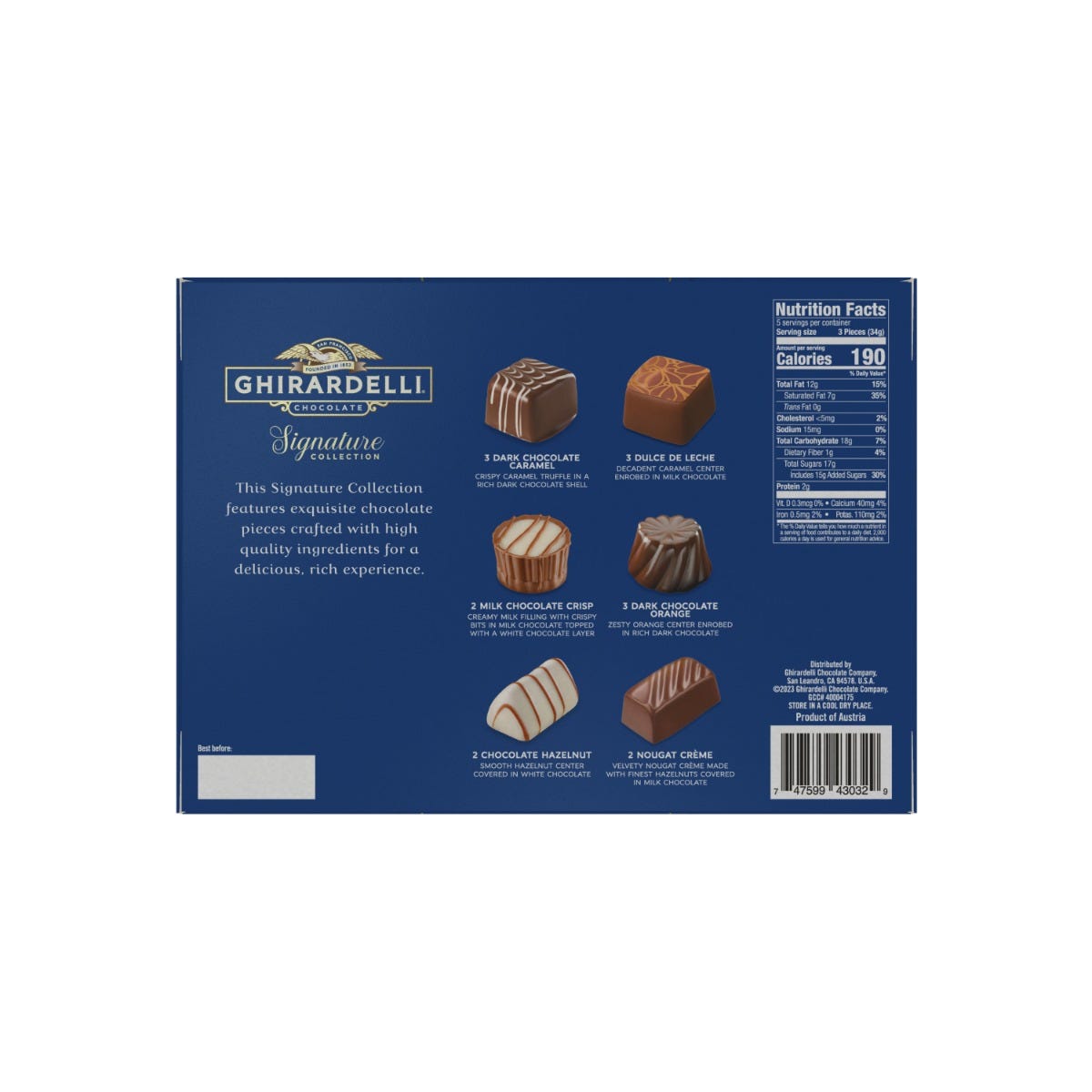 Celebrate with this exquisitely crafted Ghirardelli Signature Collection chocolate assortment. This beautiful blue gift box adds a touch of elegance to any gifting or sharing occasion. Delight family and friends with decadently rich and incredibly smooth chocolate. Taste the difference and enjoy a little indulgence. This festive gift box of candy is the perfect way to celebrate any time. Committed to ultimate quality from bean to bar, GHIRARDELLI chocolate is crafted with care using high quality ingredients for a smooth, delectable treat. GHIRARDELLI Makes Life a Bite Better!